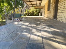 Covered deck at rear with slate tiles leading to laundry/mudroom